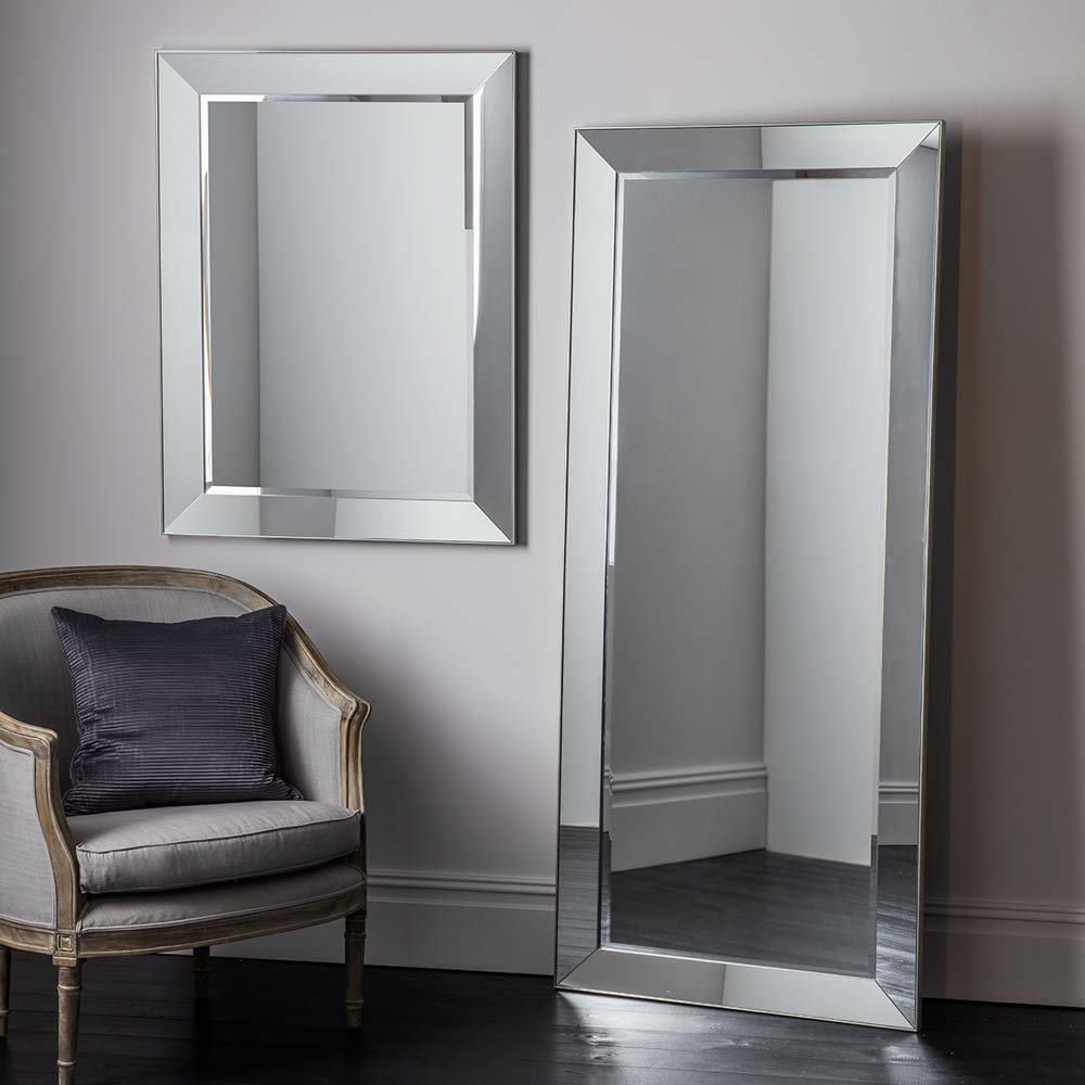 Sleek, stylish mirror with a shallow angled mirror frame and an elegant silver surround.