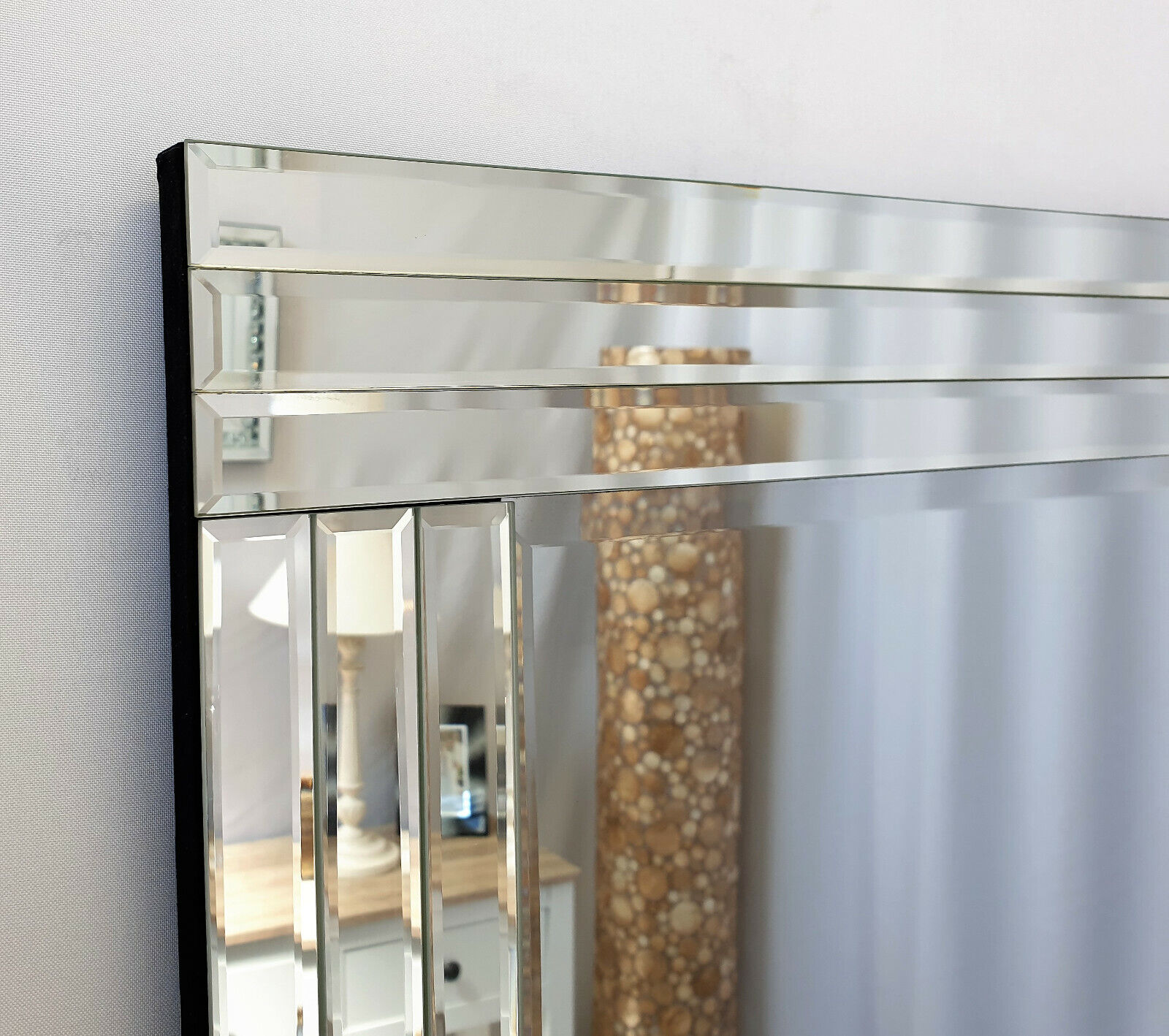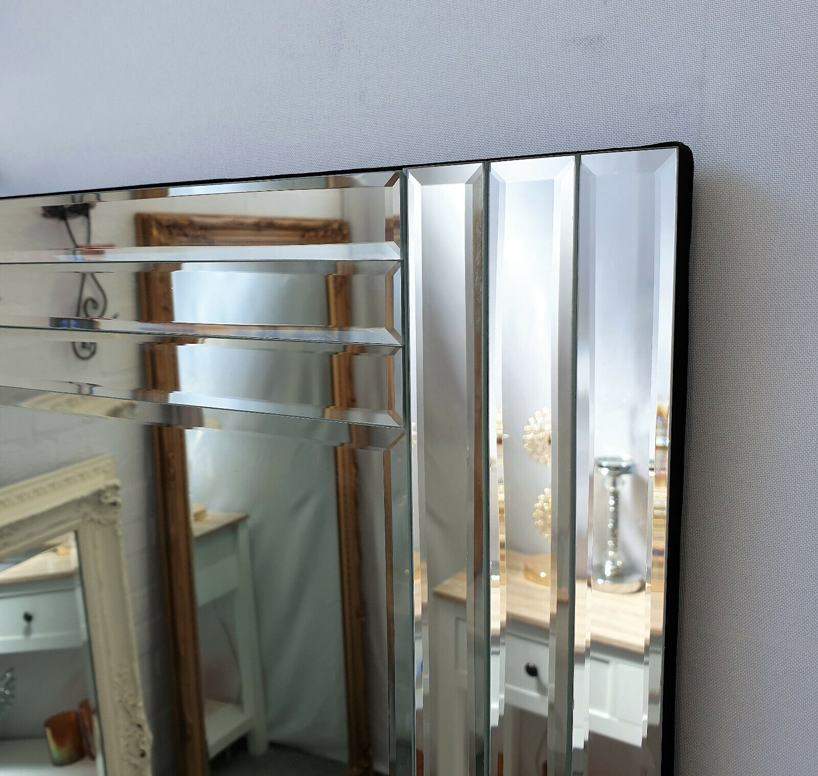 This full length modern Venetian Mirror will add style and character to any room from the bedroom to the bathroom. This mirror has a double edged frame and can be hung either landscape or portrait.