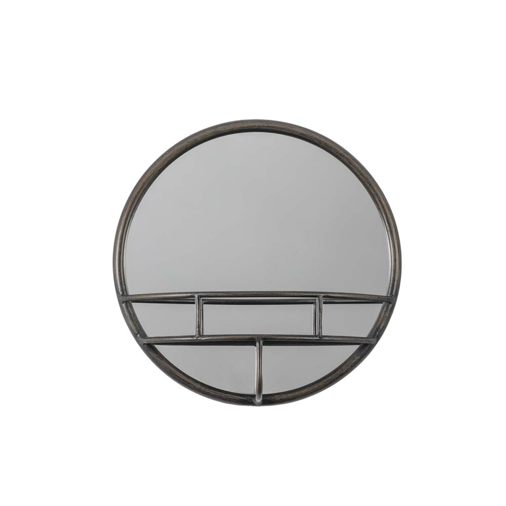 Compact design mirror with protruding shelf . Ideal for bathrooms and vanity spaces. The rustic bronze metal finish provides a cool industrial feel.