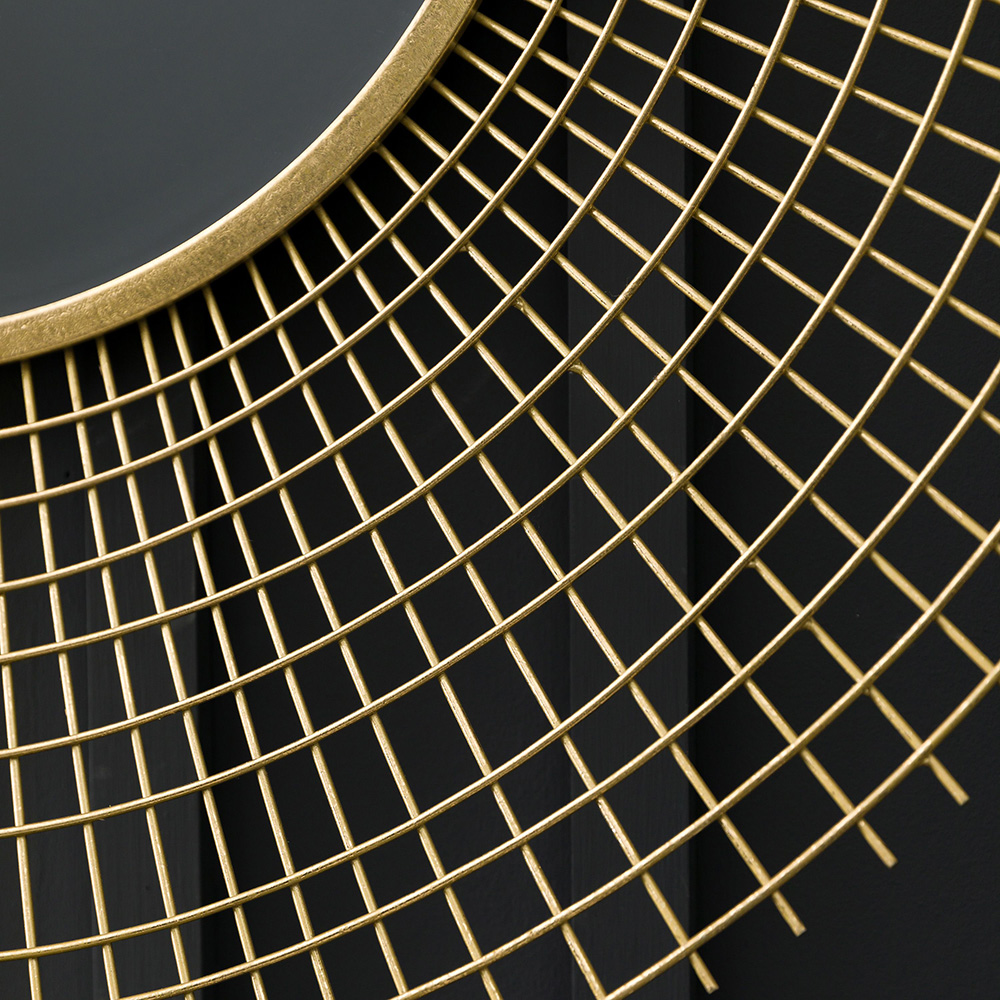 Decorative feature mirror to add a focal point to a wall, with a gold finish wirework lattice around the central mirror.